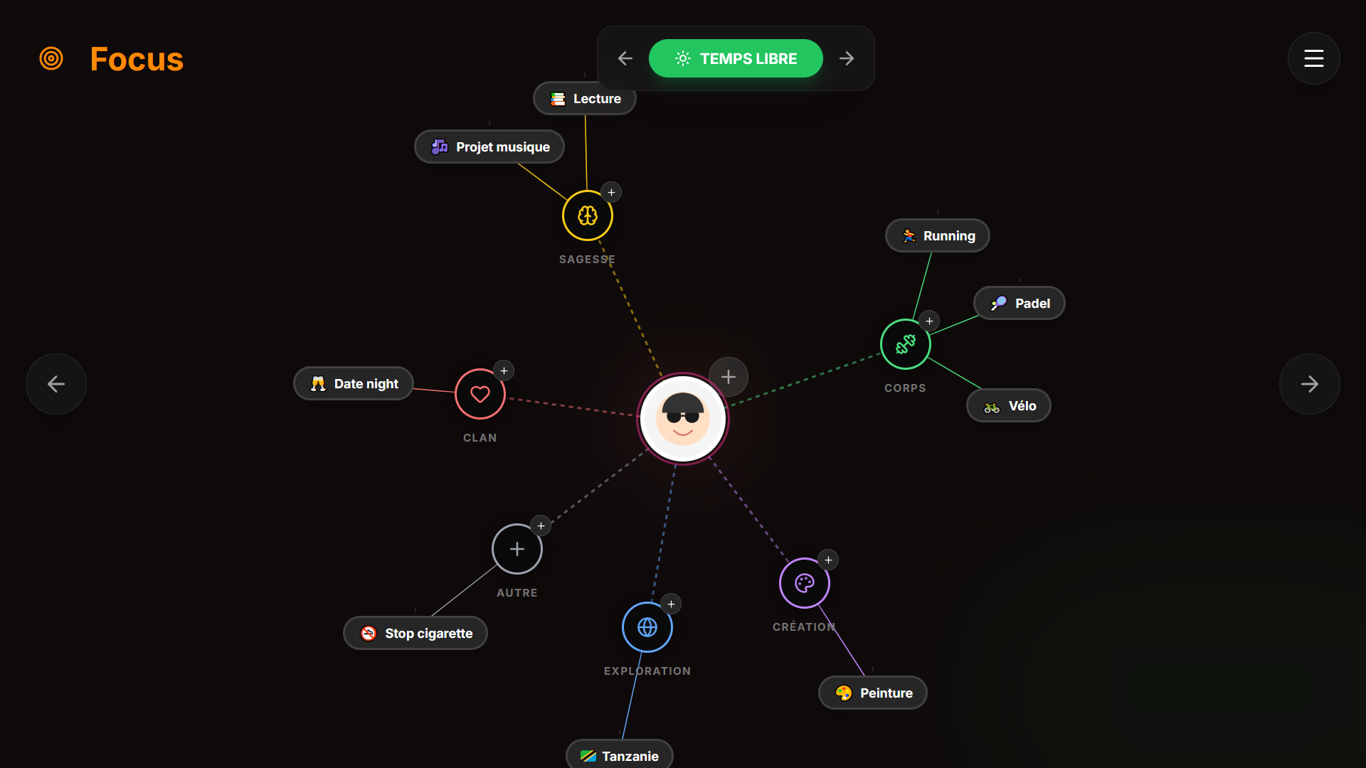 - ✦Focus (Objectifs Gamifiés) : Un système de suivi où vous gagnez des XP en prenant soin de vos piliers (Temps libre, Travail, Sommeil).